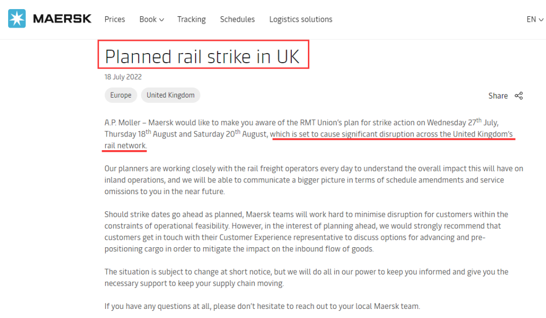 值得注意的是,英國鐵路系統(tǒng)超過5萬名工作人員繼6月份舉行近30年最大規(guī)模的罷工活動后甚至已經(jīng)把罷工計劃安排到了8月份,將分別在818日、820日繼續(xù)罷工。馬士基發(fā)布公告稱這將給整個英國的鐵路網(wǎng)絡(luò)造成重大破壞。